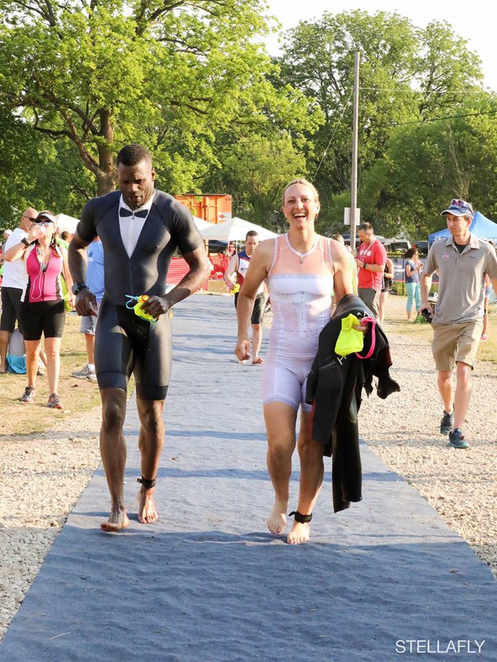 So after we contacted the race to get approval to do it, we started brainstorming. We thought it would be cool to start the race not married and end it as a married couple. So we decided to do the swim, right outside of T1, we did a quick ceremony and hopped on our bikes to do the bike portion. After that we finished the run and Kevin carried me across the finish line! It was soooo much fun! My family helped a lot with set up and making sure everyone was in the right place at the right time for the ceremony. Some of the fun details were our custom made tri kits made by our friends at Vie 13 Kustom. They made kits to resemble a wedding dress and tuxedo! I also added a veil to my bike helmet and a tool skirt to my race belt for the run. One of my favorite memories was when were running out of transition (T1) and Lori Ott was on the loud speaker yelling “ATTENTION EVERYONE! THERE’S ABOUT TO BE A WEDDING!” Then on the run we had so many people shouting congratulations, it felt so amazing and special!